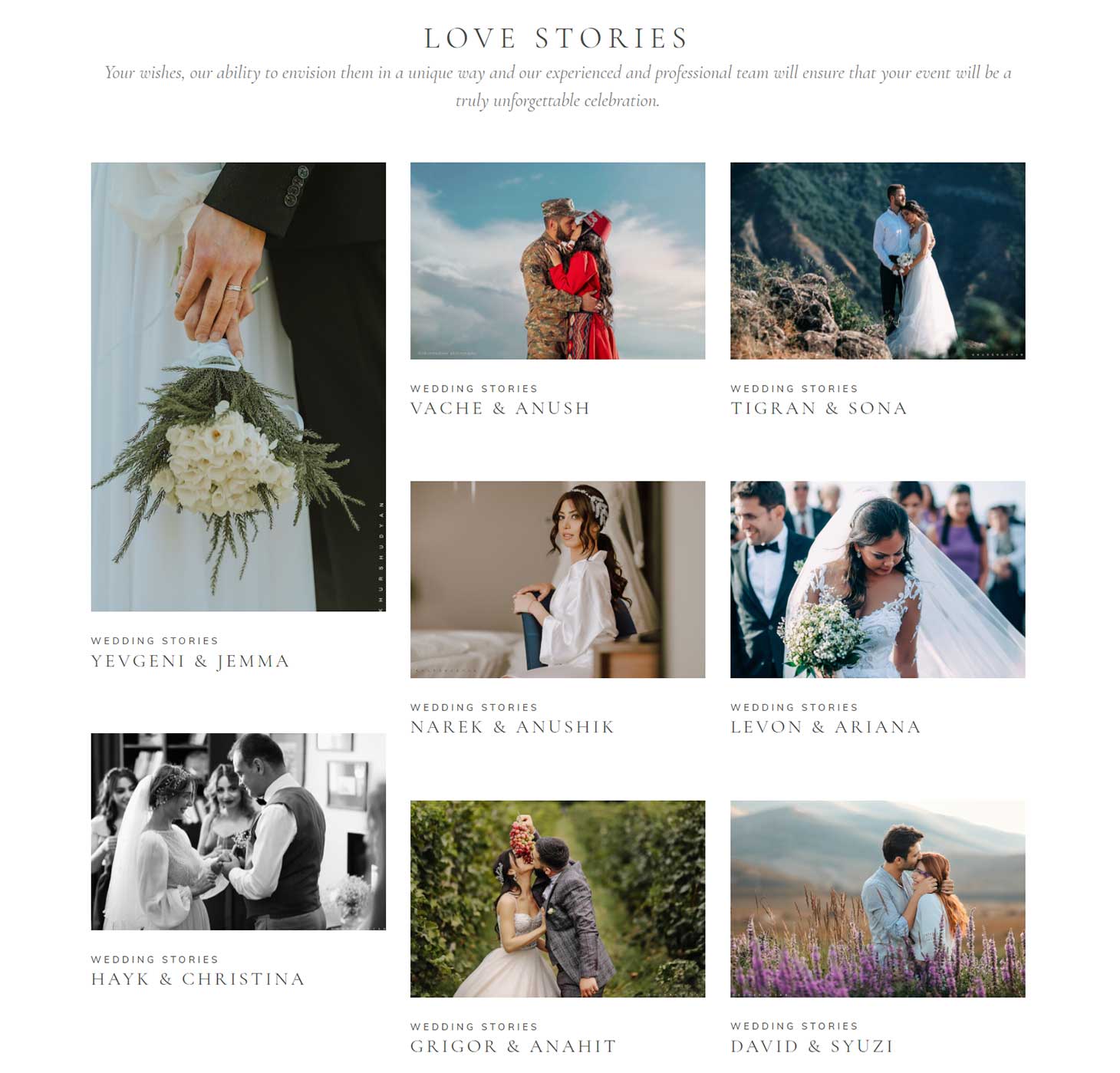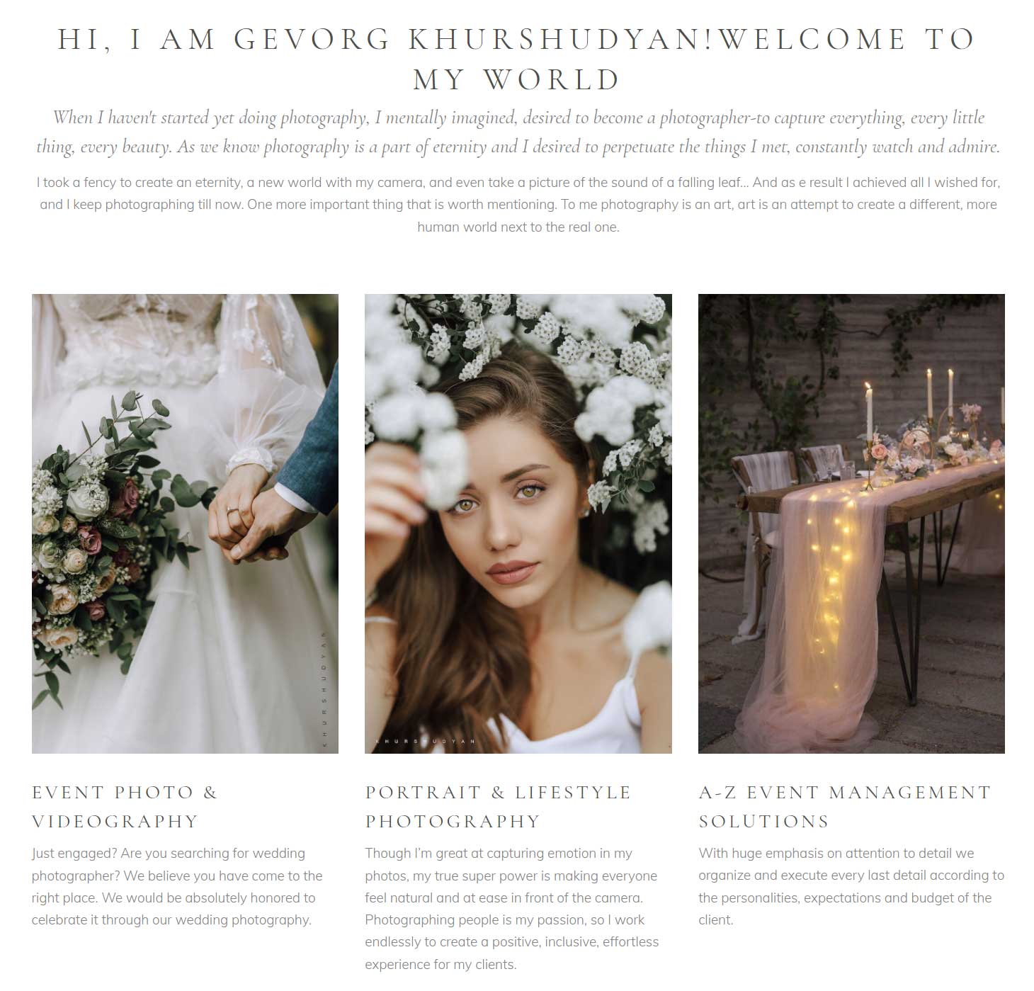 Gevorg Khurshudyan is a talented Armenian photographer. To him photography is an art, and art is an attempt to create a different, more human world next to the real one. His goal is to create lasting relationships with his clients and grow with them through all stages of their life, from engagement to their dream wedding, to starting their family and watching it grow through his lens.